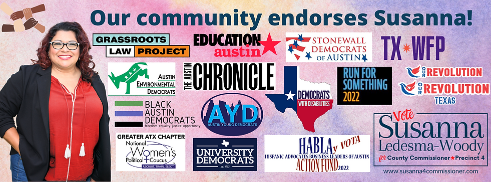 Susanna is a proud Austin native who has dedicated her life to building a more just and equitable Travis County, one where every family has access to affordable housing, quality healthcare, and real economic opportunity.